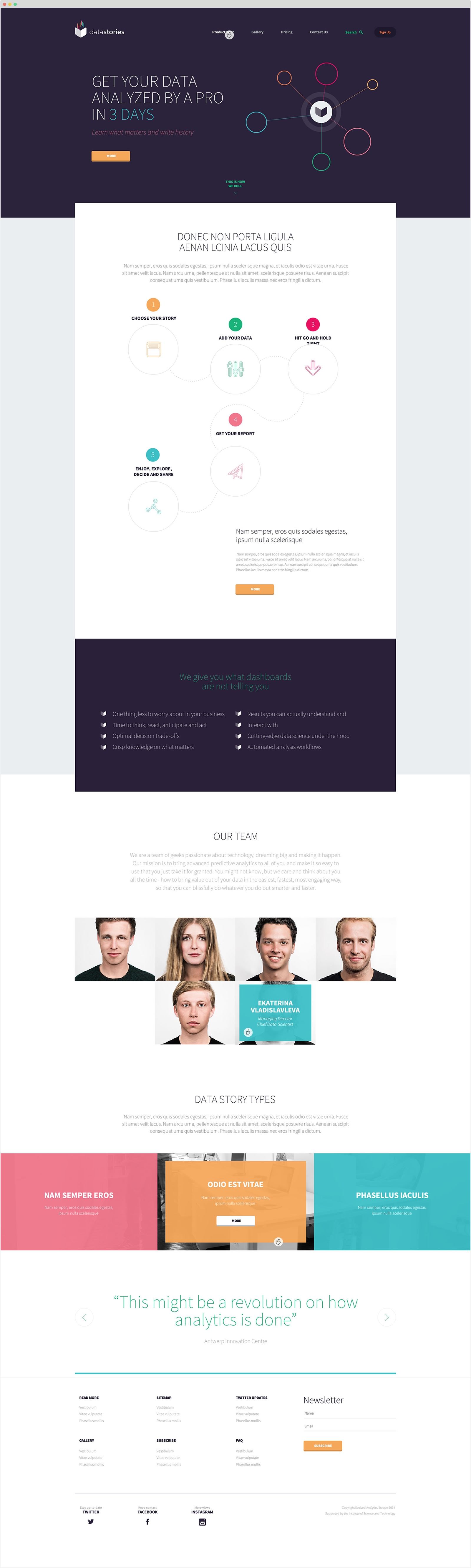 DataStories helpt bedrijven hun workflow te verbeteren met behulp van hardcore data wetenschap. Dit helpt klanten om operaties vlotter en precieser uit te voeren en daarnaast zorgen zij in samenspraak voor de beste en wetenschappelijk onderlegde beslissingen voor uw bedrijf.