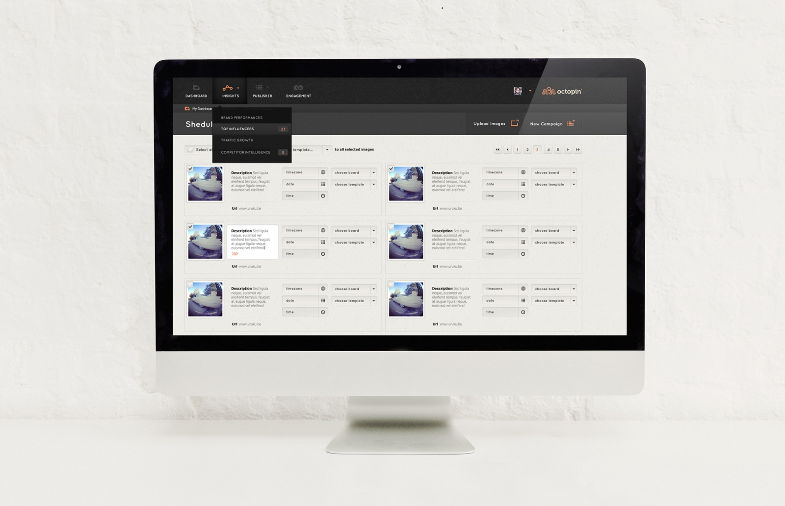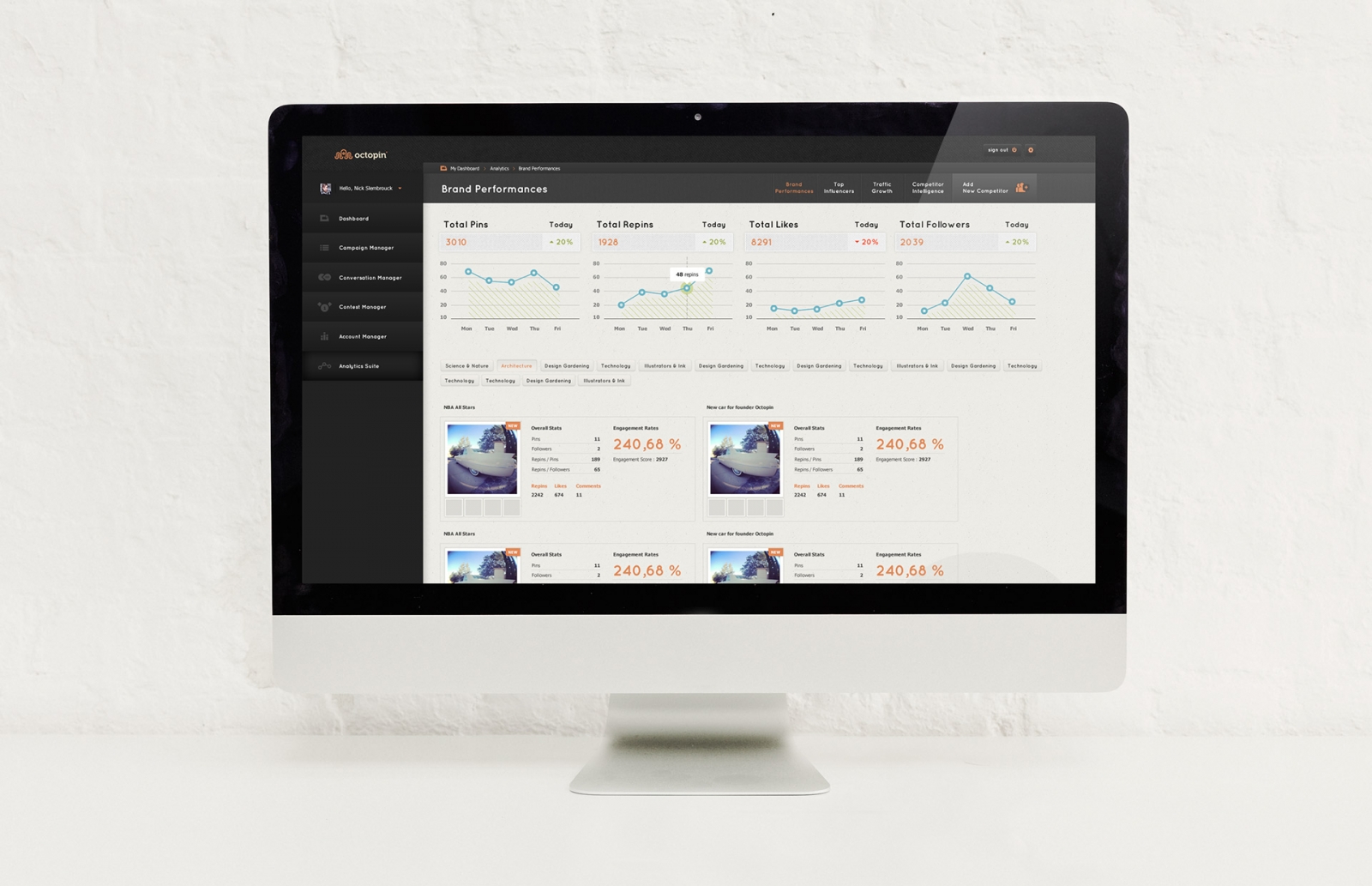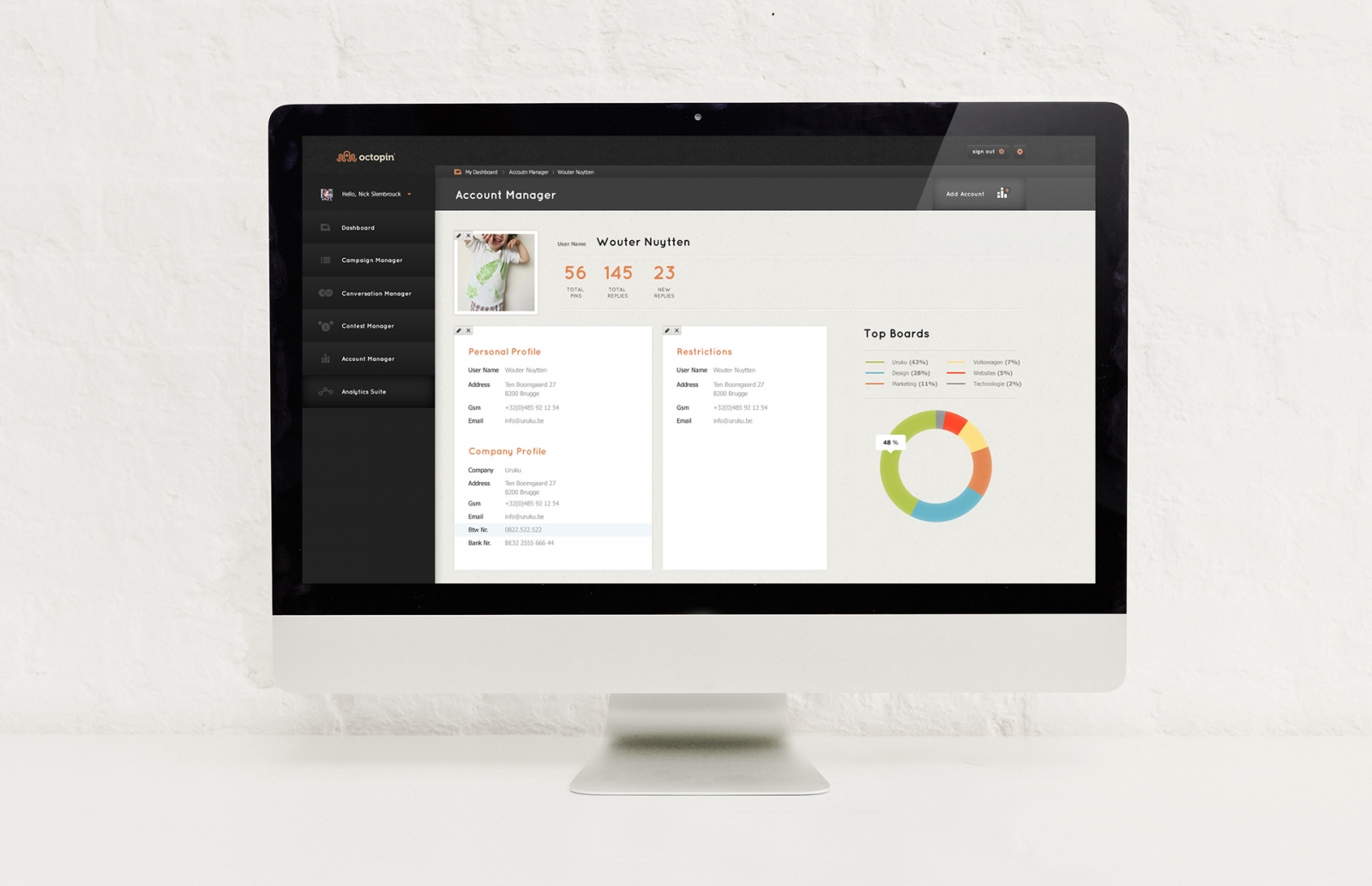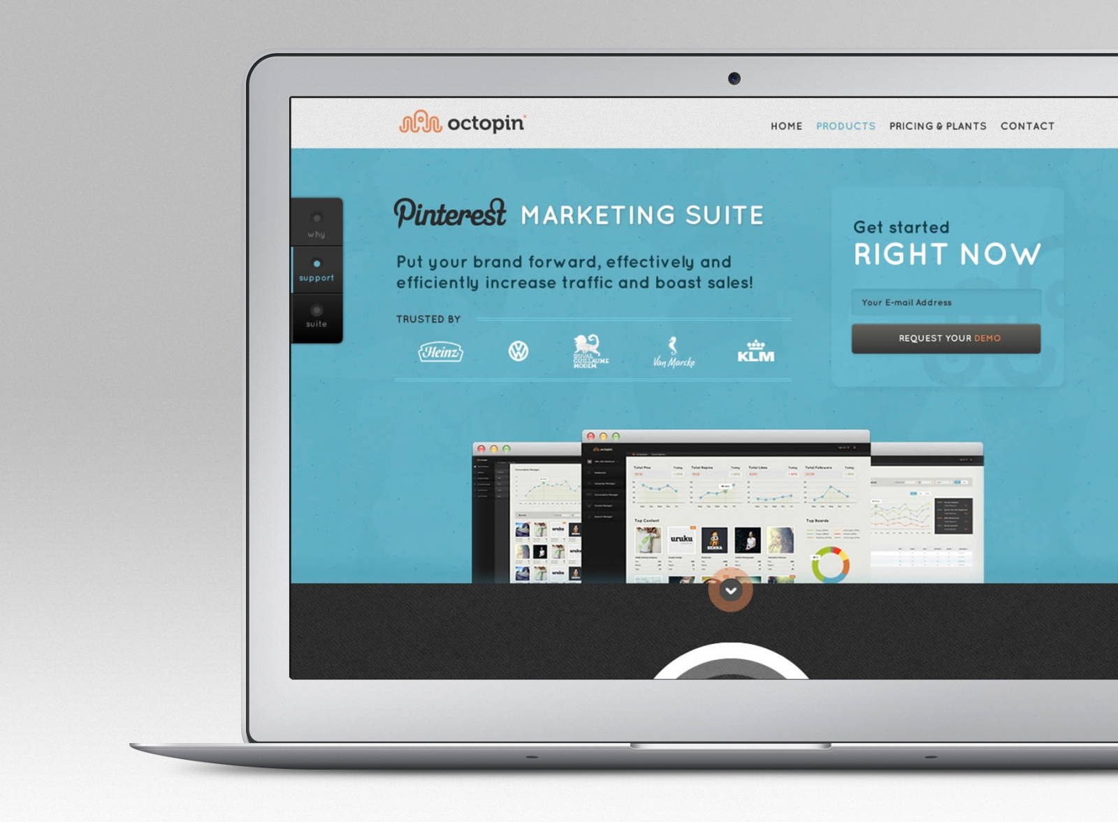 Met early adapters als Heinz Ketchup, Van Marcke, KLM, Volkswagen, Duval Guillaume, ... is Octopin de grootste Pinterest Marketing Suite van Europa. En daar stopt het niet bij: begin 2013 opende Octopin een tweede kantoor in New York om van daaruit Amerika te veroveren. Met dit pakket kan je uw Pinterest account van uw bedrijf of merk makkelijk beheren en analyseren en zo optimaal inspelen op de markt.