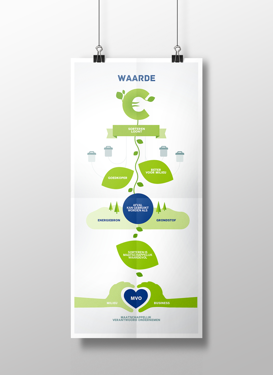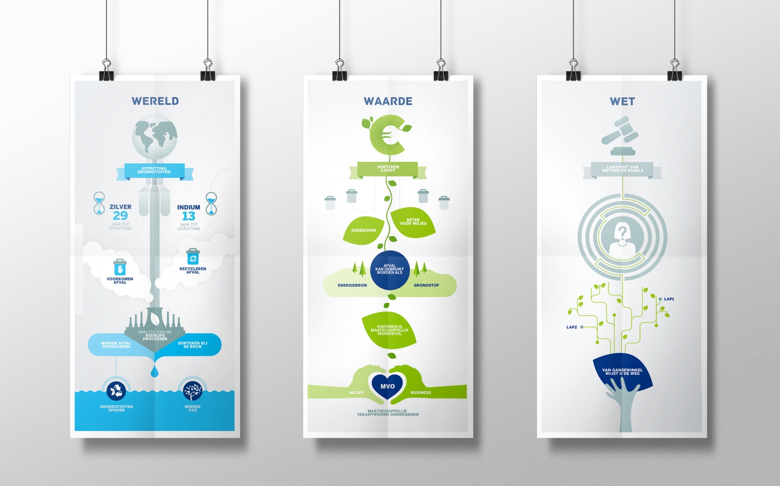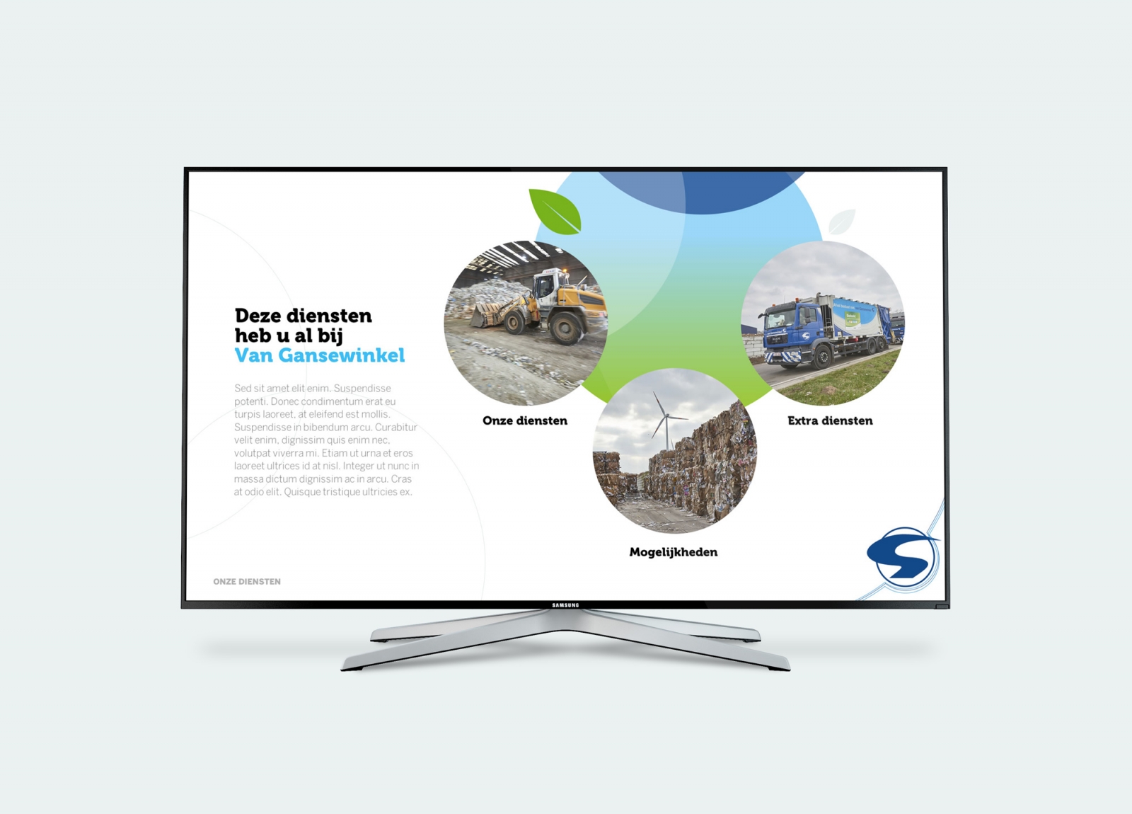 Van Gansewinkel Groep is zowel afvaldienstverlener als grondstoffen- en energieleverancier. Het bedrijf zamelt afval in en bewerkt of verwerkt afval tot grondstoffen en energie. Thuismarkt is de Benelux, maar Van Gansewinkel Groep is ook actief in Duitsland, Frankrijk, Portugal en Hongarije. In opdracht van Proud Mary werkten we 3 bij elkaar horende infographics uit en een presentatie template die Van Gansewinkel volledig zelf kan beheren.