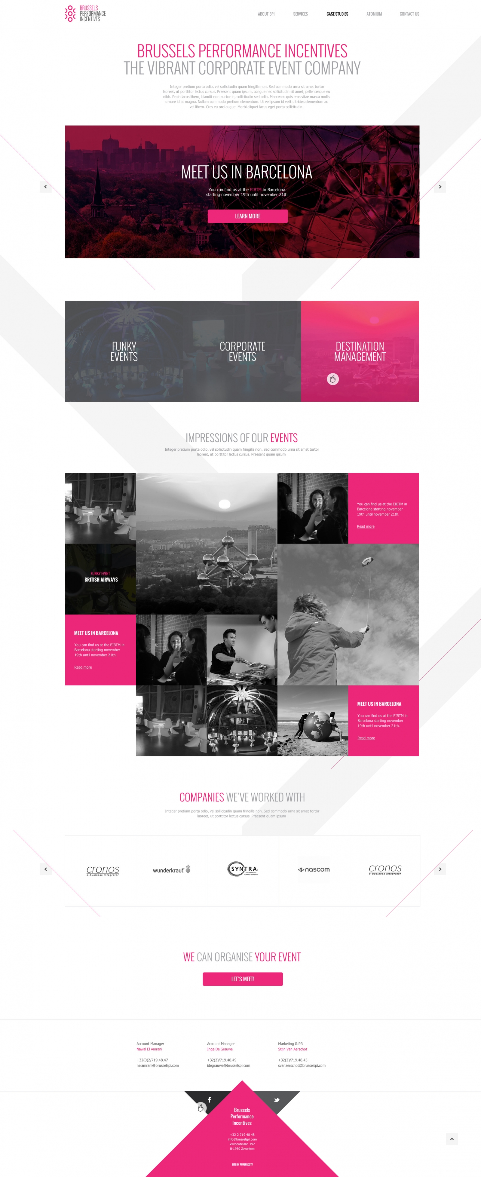 Brussels Performance Incentives biedt corporate meetings en events aan om bedrijven te helpen hun business objectives halen. Dit doen ze door de ervaring van de deelnemers altijd op de eerste plaats te zetten door een creatieve, originele en innemende creatie van elk event. De website is opgebouwd uit schuine lijnen en felle kleuren om de funky aanpak van BPI te reflecteren.